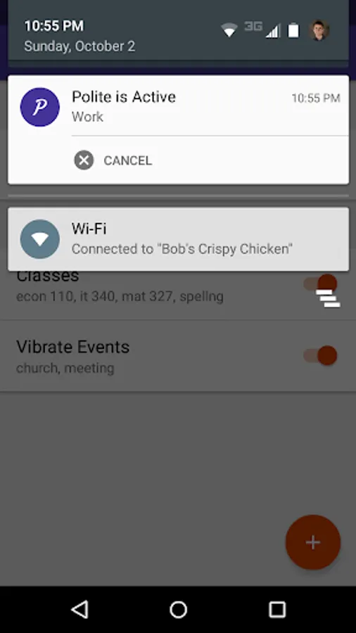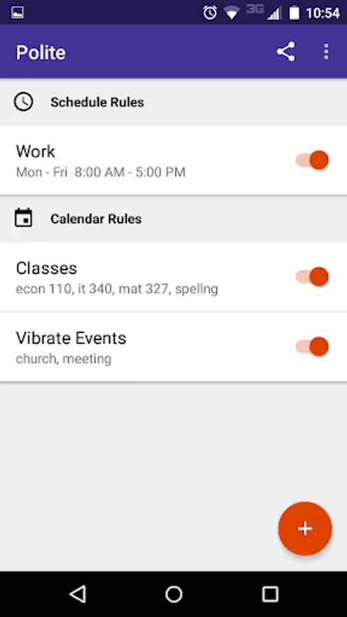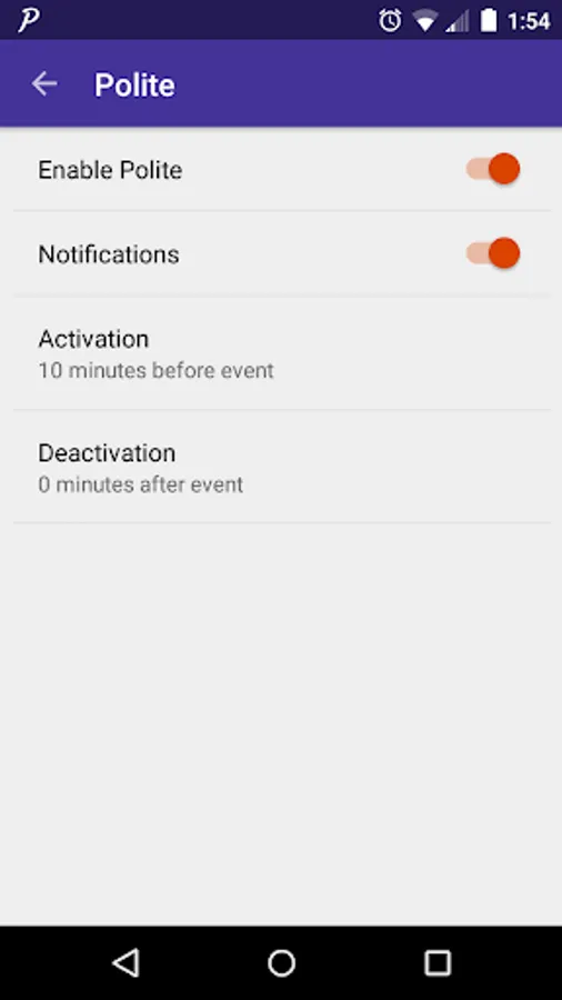 Don't let your phone interrupt you when it should be quiet. That's rude! With Polite, your phone will automatically go into silent mode (or vibrate mode) at the right times. You can choose specific times in your weekly schedule to automatically enter silent mode. You can also have your phone enter silent mode during calendar events in your calendar app. You can even enter keywords such as "meeting" and Polite will silence your phone whenever you have a calendar event with that keyword in the event title (e.g. "Meeting with manager"). It's time to teach your phone some manners!