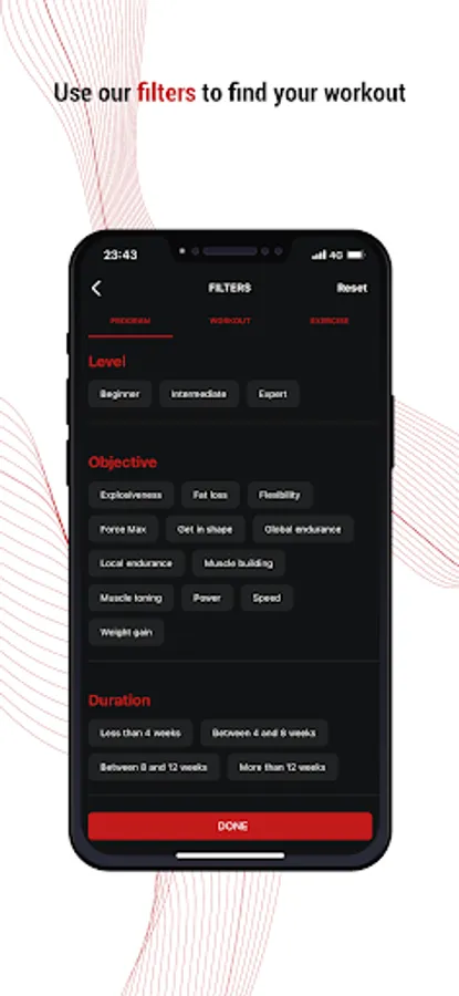 - Use filters in "Discover" to find out the workouts or programs that matches your goals!