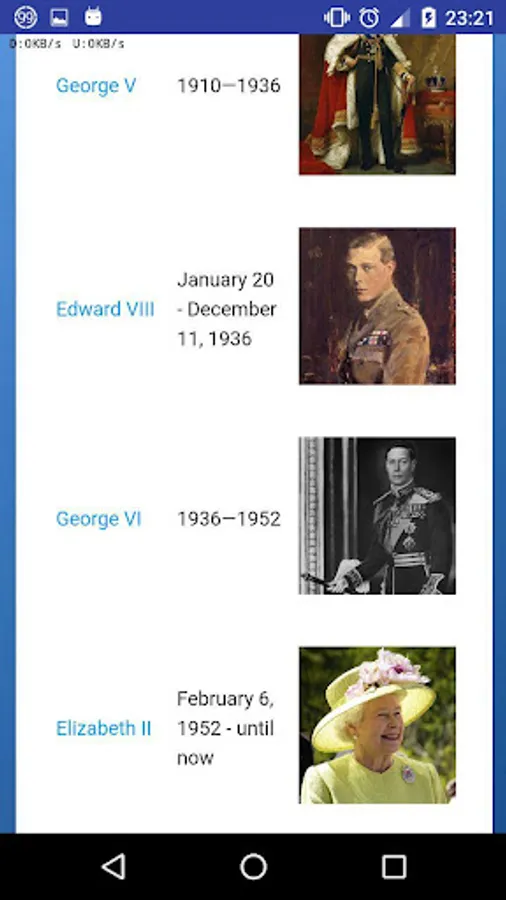 In the application, you will see such prominent representatives of the House of Wessex - Alfred the Great and Æthelstan Nice, House of Normandy - William I the Conqueror, House of Plantagenet - Richard the Lionheart, House of Lancaster - Henry V, House of York - Edward IV, House of Tudor - Elizabeth I, House of Stuart - Charles I and Anna House of Hanover - Queen Victoria, House of Saxe-Coburg-Gotha - Changed George V of Windsor, in connection with the First World War and many others.