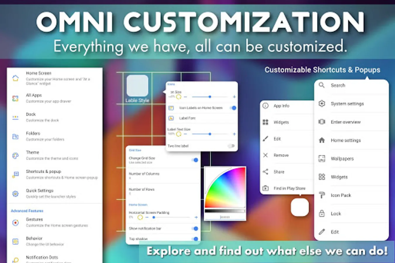 5.Long press on App icon show shortcut menu, "edit", “share”, “find in Play store” etc. (Action items can be custimzed at Shortcuts & Popup Setting)