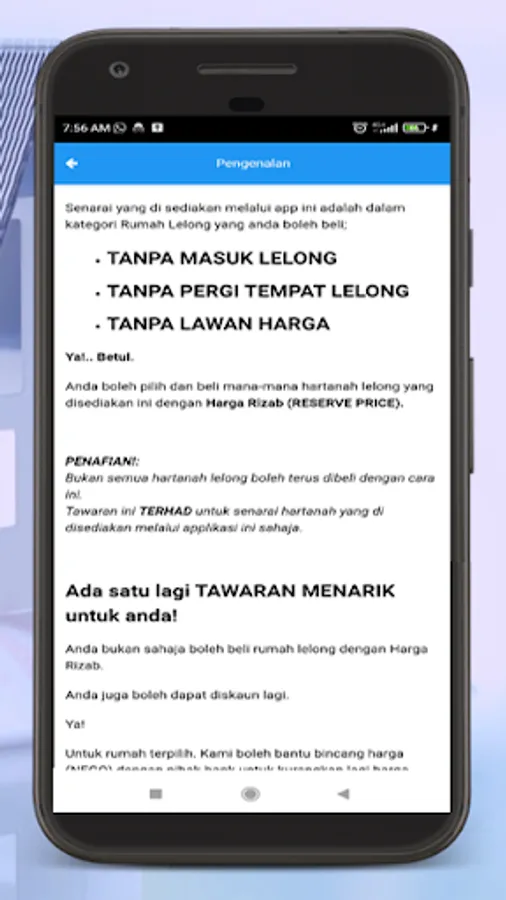 Aplikasi ini menghimpunkan senarai hartanah lelong yang boleh terus beli dengan bank tanpa perlu masuk lelong dan tanpa perlu lawan harga.