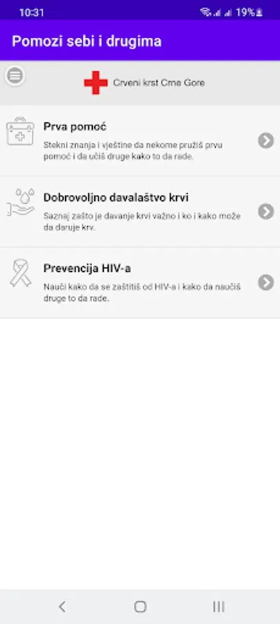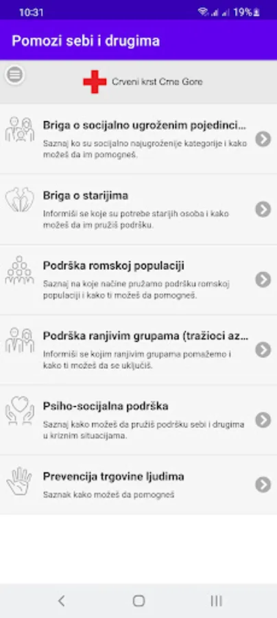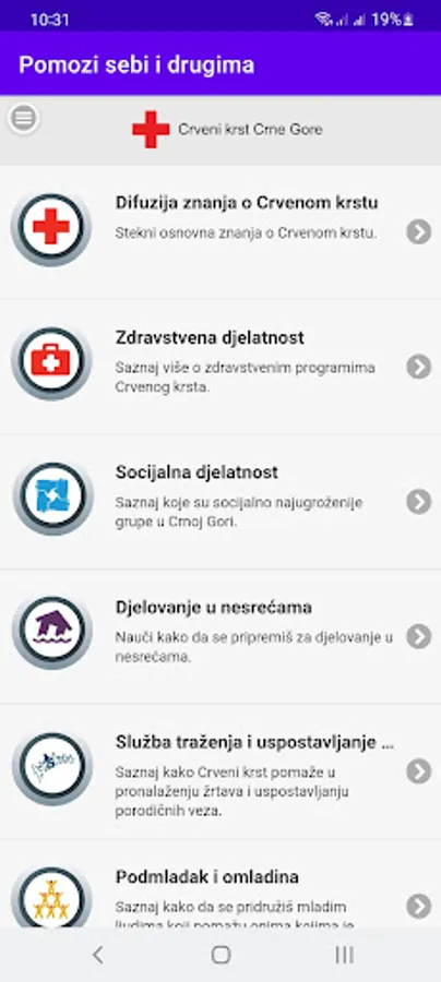 The application "Help yourself and others" contains detailed information from the domain of the Red Cross, which refers to reacting in regular and extraordinary circumstances. The information you download through the app can help you or someone in your environment at the right time and also provide you with information on how you can be useful and socially responsible (eg how and where you can donate second-hand clothes; who, how often and to whom the way he can donate blood voluntarily, how to act in case of an earthquake, how to help someone in case of a car accident, how to volunteer at the Red Cross, etc.). We are sure that you will find a lot of useful information, and for more you can visit our website or social networks.