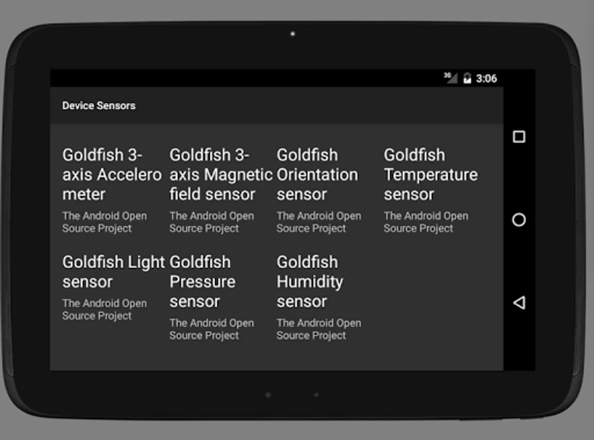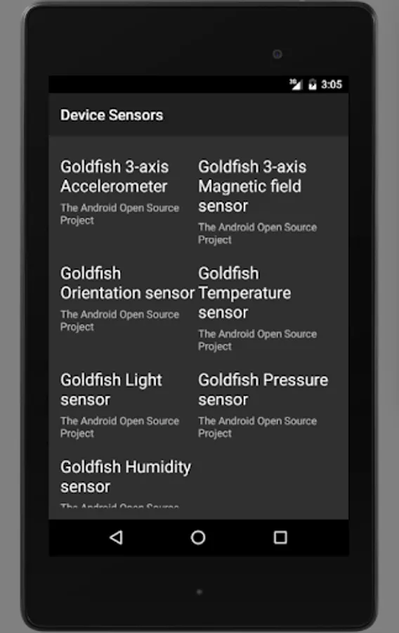 There are many Android devices in the market with many different sensors and manufacturers for said sensors. Have you ever wondered what all is "under the hood" or who made it? This app displays all the sensors and their related manufacturers so you don't have to lose sleep (not that you were ;-).