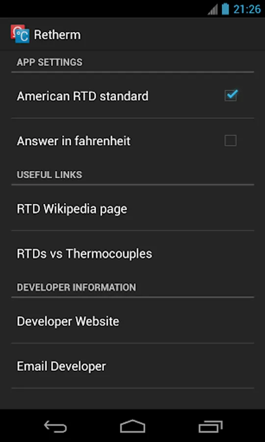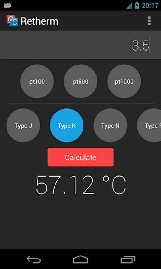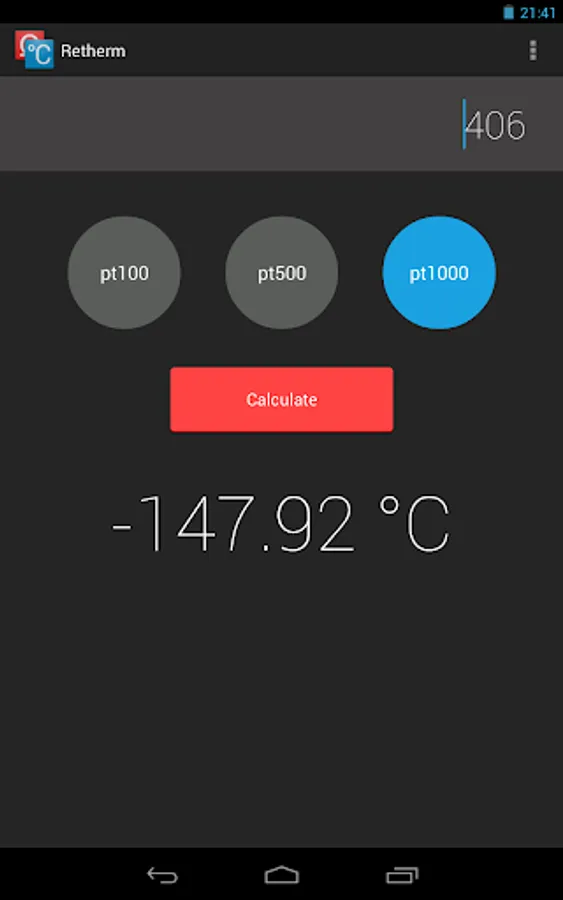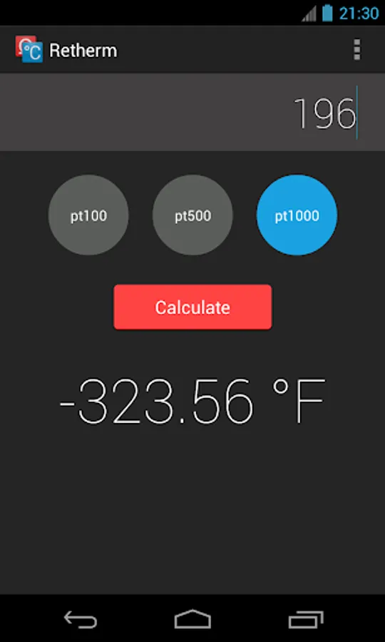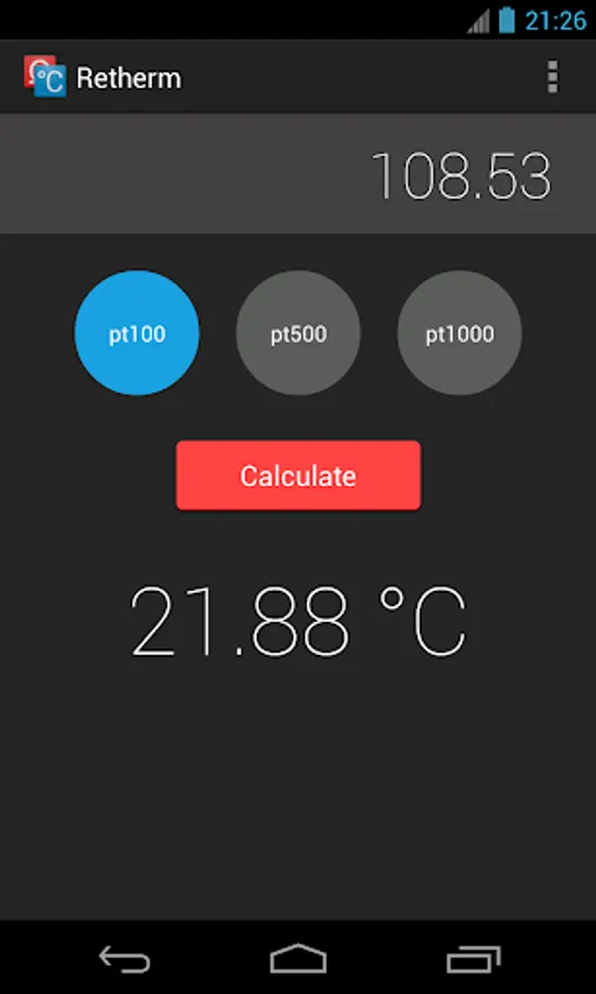 Retherm is a simple application that converts resistances from RTD sensors to temperature. This app can currently convert Pt100, Pt500 and Pt1000 resistances to degree Celsius or Fahrenheit. The standard equations are done to the popular European/DIN standard for the temperature range of -200°C to +850°C with an average margin of error of about 0.02°C. An option is available for calculations to the less used American standard for the range 0 to 100°C with an average margin of error of about 0.2°C.