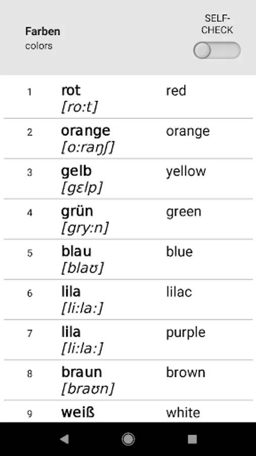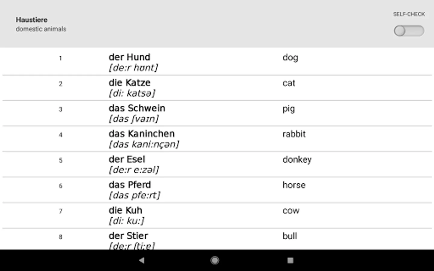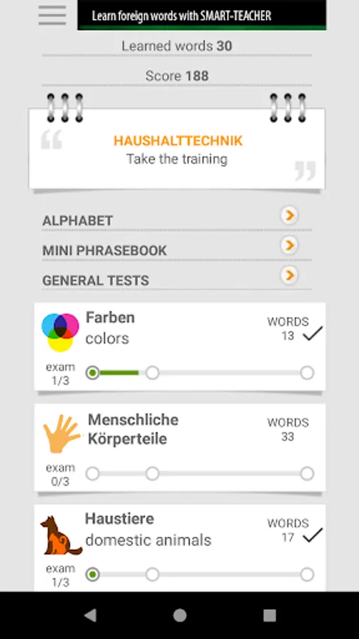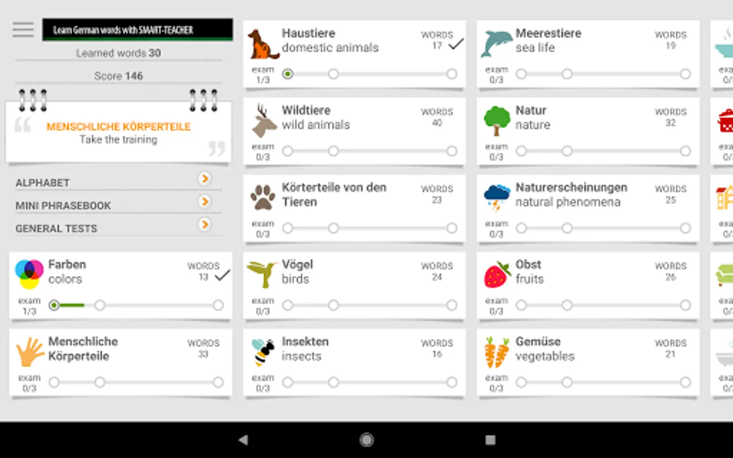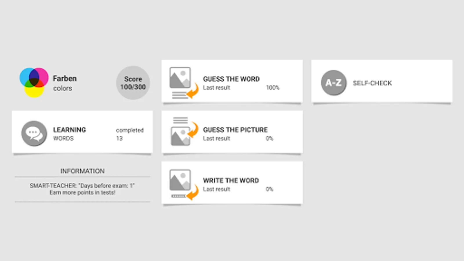 - Testing of the knowledge of the words happens through fun and simple tests: