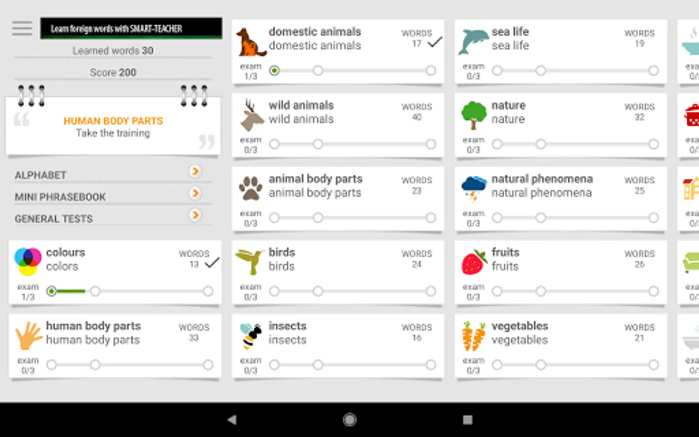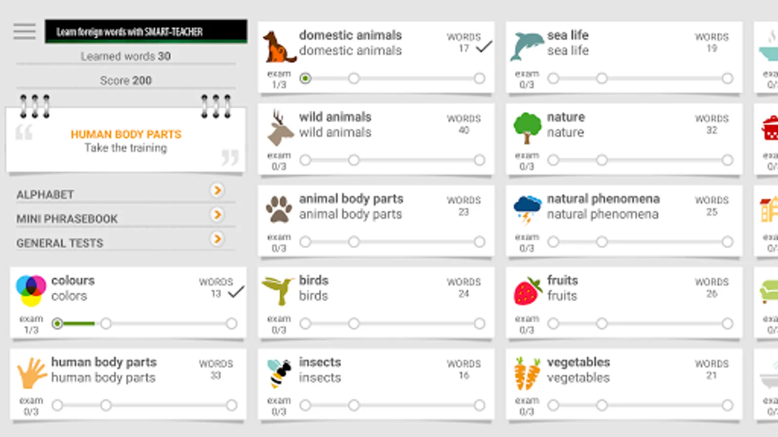 List of topics: colours; human body parts; domestic animals; wild animals; animal body parts; birds; insects; sea life; nature; natural phenomena; fruits; vegetables; food; kitchenware; home; home interior; bathroom; home appliances; tools; office; school supplies; school; numbers; geometric shapes; musical instruments; shop; clothes; shoes and accessories; toys; infrastructure; transport; travel; entertainments; information technology; human; society; professions; sport; summer sports; winter sports; prepositions; verbs.