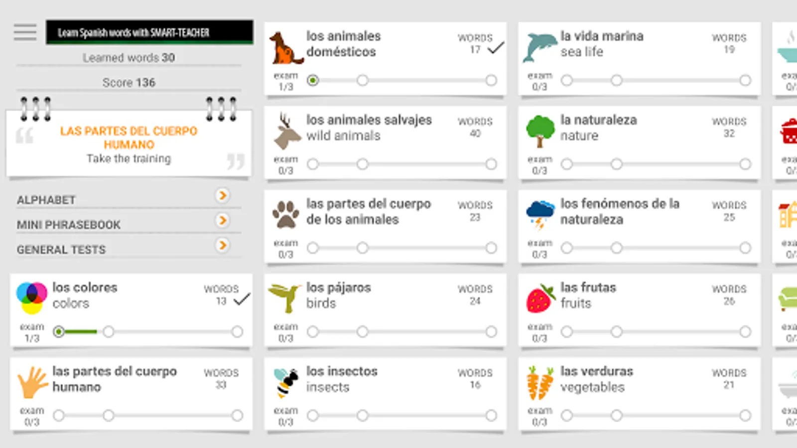 - Testing of the knowledge of the words happens through fun and simple tests: