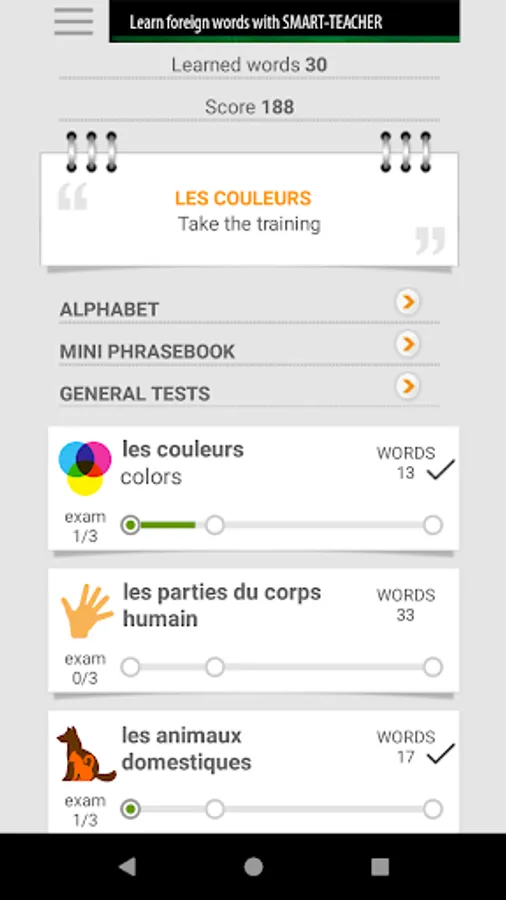 - Testing of the knowledge of the words happens through fun and simple tests: