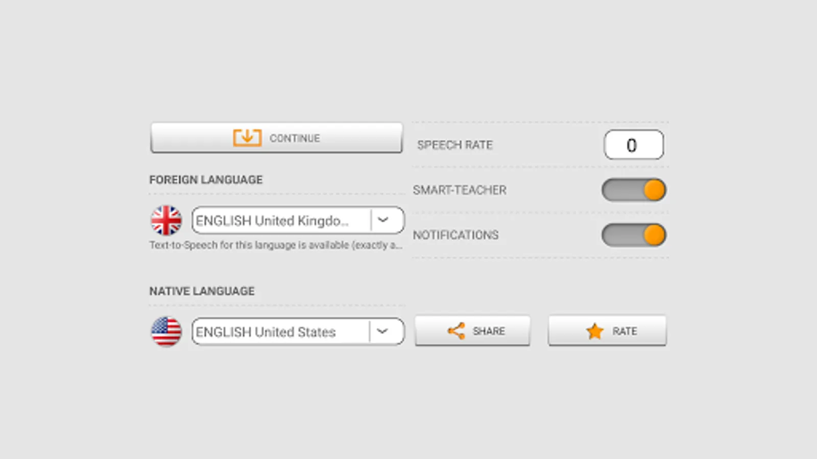 - Learning the alphabet, parts of speech, such as nouns, adjectives, verbs with phonetic transcription through flashcards and sound accompaniment by TTS (text-to-speech).