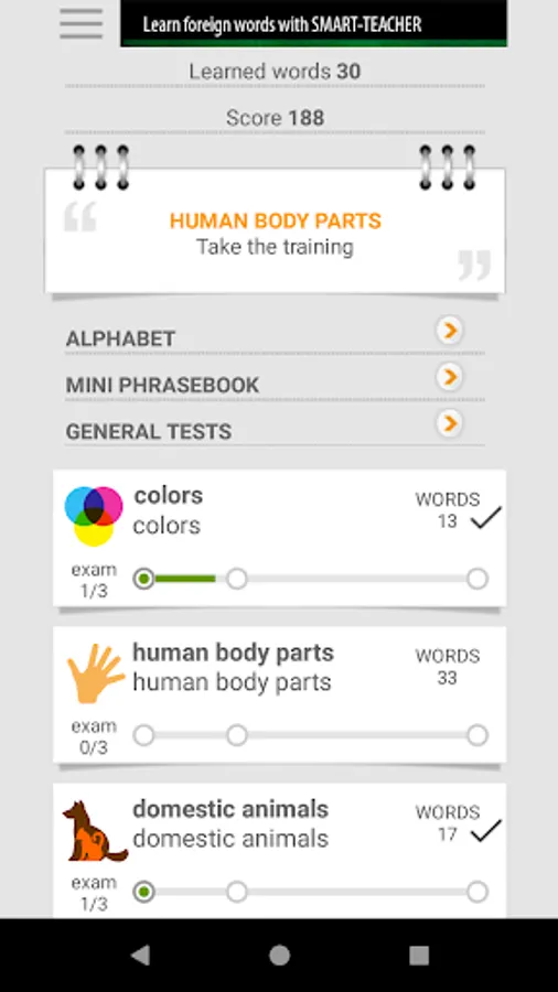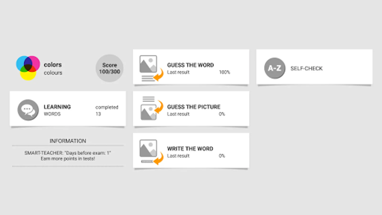 - Testing of the knowledge of the words happens through fun and simple tests: