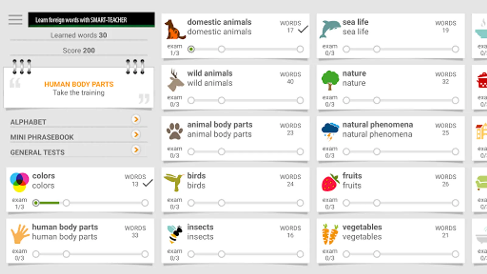 List of topics: colors; human body parts; domestic animals; wild animals; animal body parts; birds; insects; sea life; nature; natural phenomena; fruits; vegetables; food; kitchenware; home; home interior; bathroom; home appliances; tools; office; school supplies; school; numbers; geometric shapes; musical instruments; shop; clothes; shoes and accessories; toys; infrastructure; transport; travel; entertainments; information technology; human; society; professions; sport; summer sports; winter sports; prepositions; verbs.