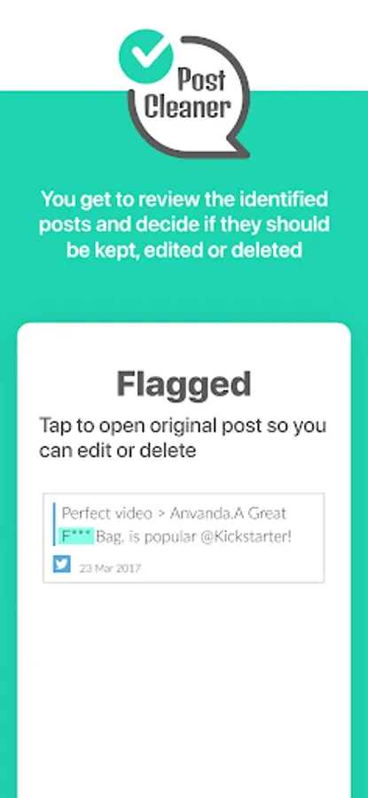 Post Cleaner privately analyzes your social media posts and identifies potentially offensive content. Profanity, vulgar phrases, and other objectionable language are identified, and then a left/right swipe function allows you to quickly sort through flagged content to dismiss or mark for editing.