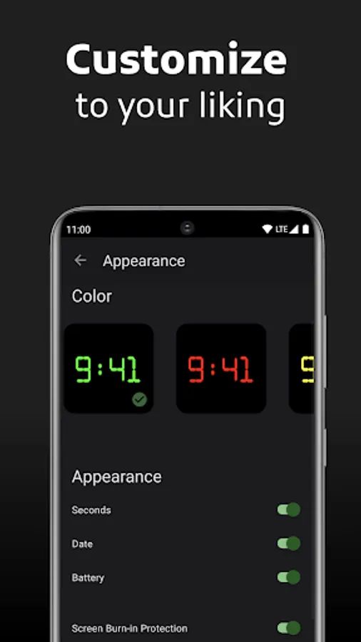 • Fully customizable digital clock face appearance: Seconds, Date, Battery Percentage, Color — you name it.