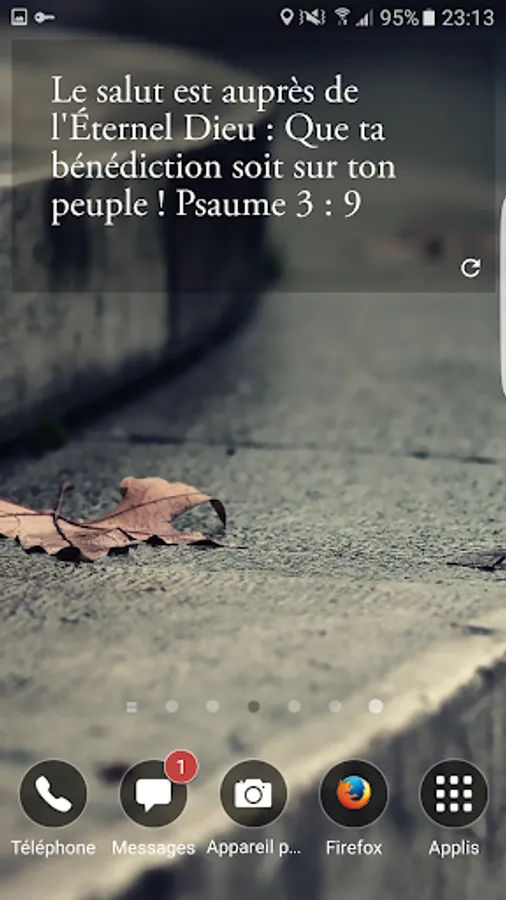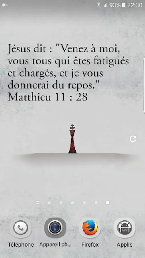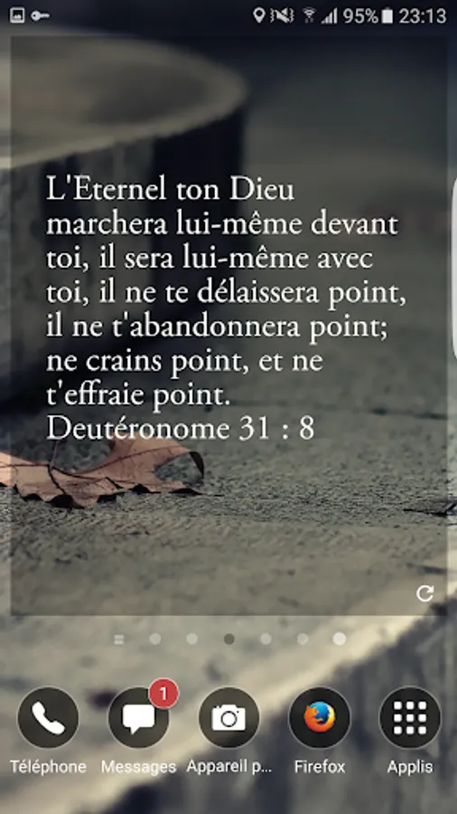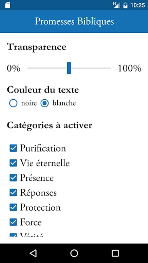 It is possible to choose the transparency of the background, the color of the text between black and white, and especially the 46 categories that will be selected to display a new verse of the Bible every 30 minutes. It is also possible to display a new Bible verse through manual refresh.