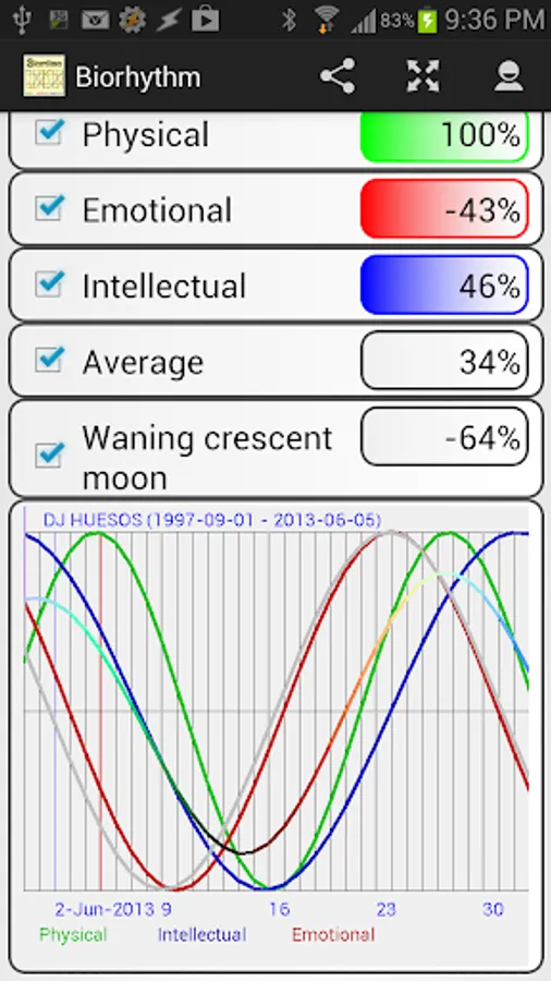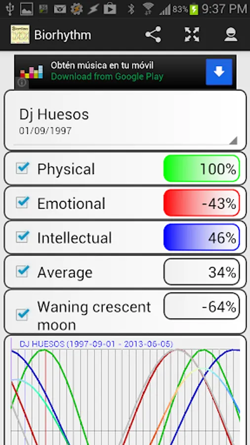 Check your daily Biorhythm, your Physical, emotional and intellectual levels, the average and lunar phases.