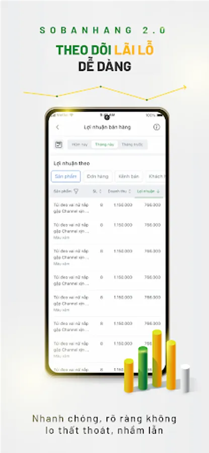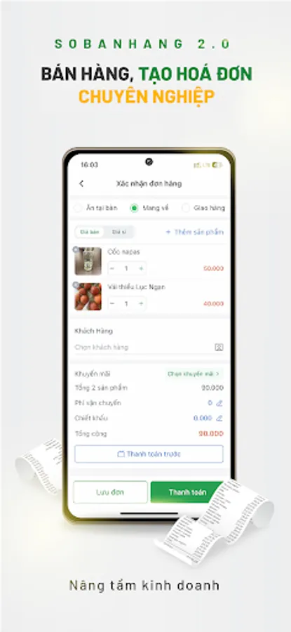 Using the phone as a POS machine, the Sales Book helps shop and restaurant owners easily create and print retail invoices, manage costs, revenue, and automatically calculate profit and loss accurately and quickly. No need for a computer, or a vending device.