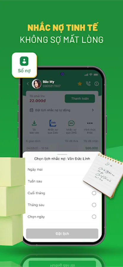 - Set an automatic debt reminder schedule, remind customers of debt via SMS, Zalo, SMS channels...