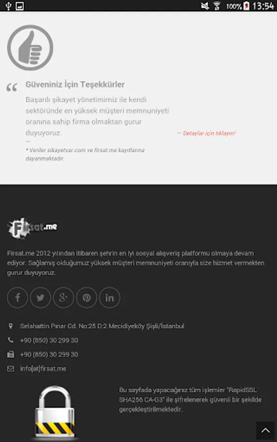 • “RapidSSL SHA256 CA-G3” 256 bit SSL certificate is used in all transactions you will make on Firsat.Me, so all your transactions are confidential and cannot be tracked by third parties.