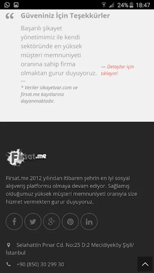 • You can get support via e-mail 24/7 from Firsat.Me, send feedback, message us on Twitter or Facebook, or contact our call center at +90 (850) 30 299 30 between 09-17 on weekdays.