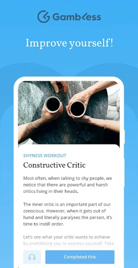 As a self coaching app, Gambless features mental workouts for many negative feelings such as shyness, envy, loneliness, apathy, anger, frustration, anxiety, resentment. All mental workouts are neatly divided and feature tasks that you need to perform for long-term self improvement.