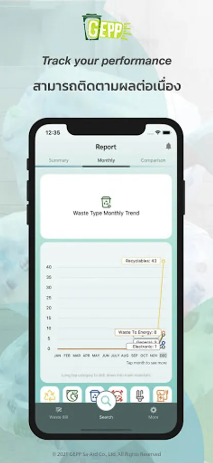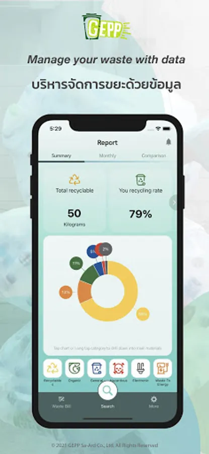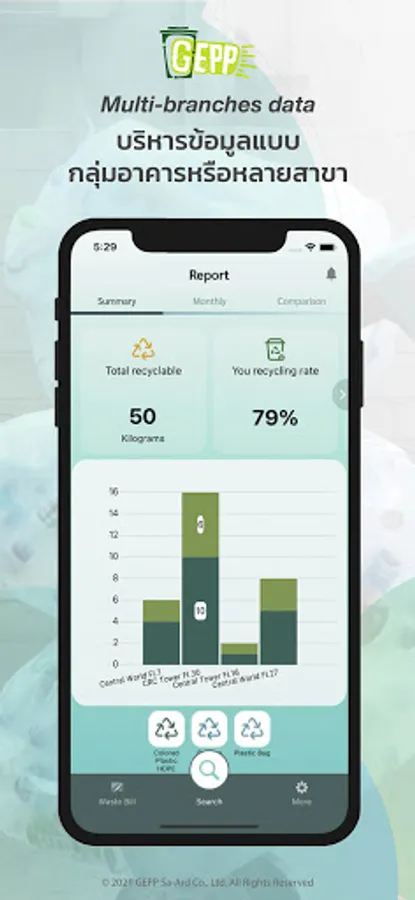 - Standard of waste separation and storage according to Thai and international standards, such as the calculation of the Carbon Footprint Organization of the Greenhouse Gas Organization of Thailand (ISO-14001), SET SD Report (ESG Goals).