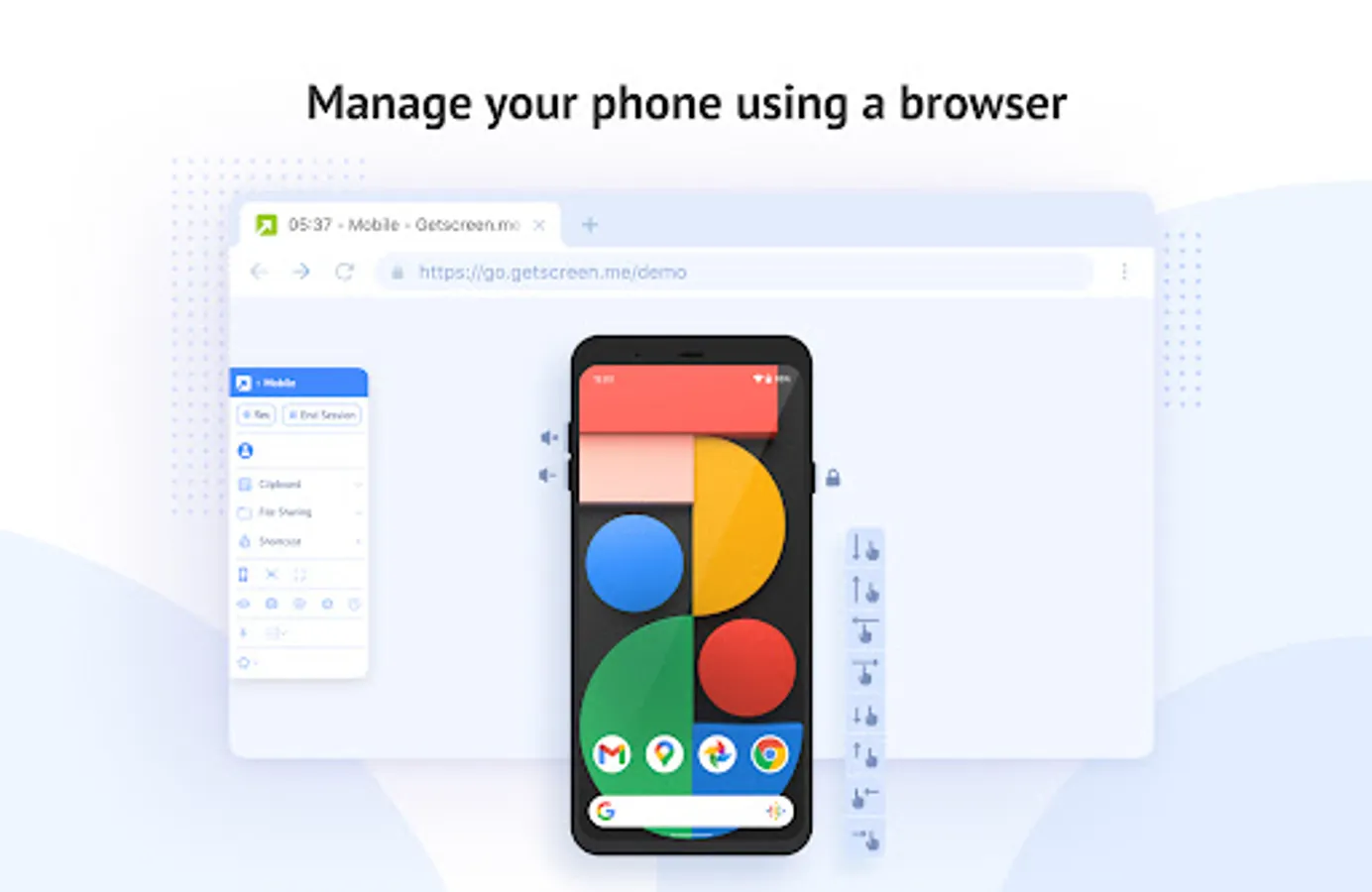 Getscreen.me - cloud-based remote access software now in your smartphone! This application allows you to control the phone remotely from a web browser on another device. You can also send a link to another user so he can see your screen on his phone.