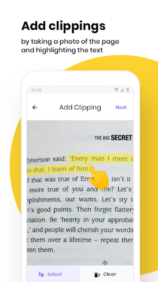 • Take a photo of the book you're reading, and use the highlighter tool to select text