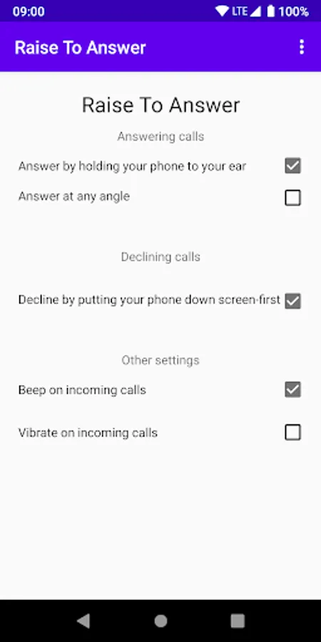 Simply hold your phone to your ear to answer an incoming call. When the app detects the phone is near your ear during an incoming call, it will beep 5 times and then answer the call.