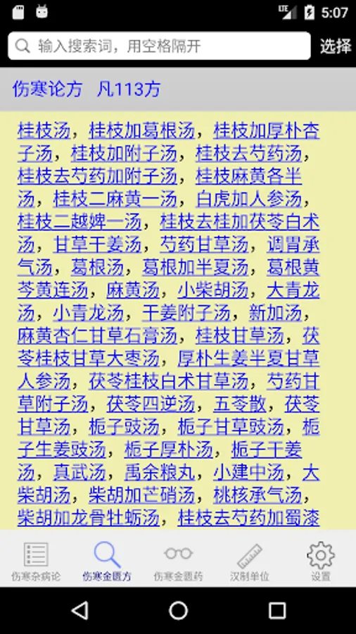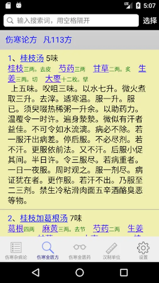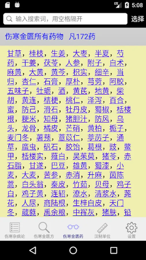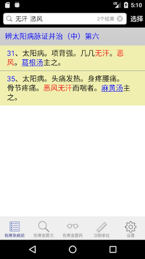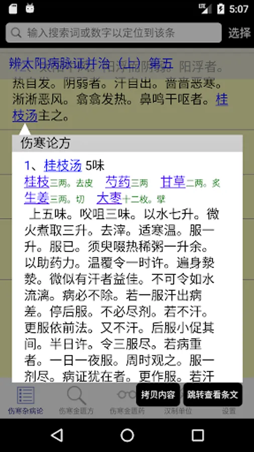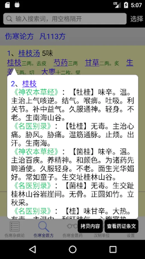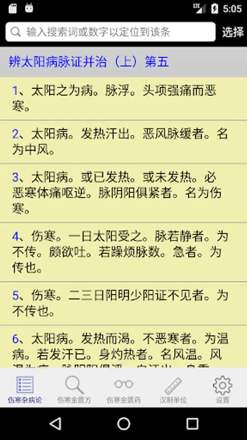 This application shows in tabular form Treatise on the 398 and 113 square original content, and optionally Golden Chamber of content, you can easily filter search provisions to make studies or enter figures directly slid to a certain clause in order to make learning , the search box also supports multi-keyword query, separated by a space as long as you can, also supports wildcard search, but the wildcard "#" or ".", the keyword search results will be red for easy viewing results. This is a lot easier to read than direct, a menu will pop up each provision of the click, you can choose to take notes, copy content, or content to target prescription provisions involved viewing.