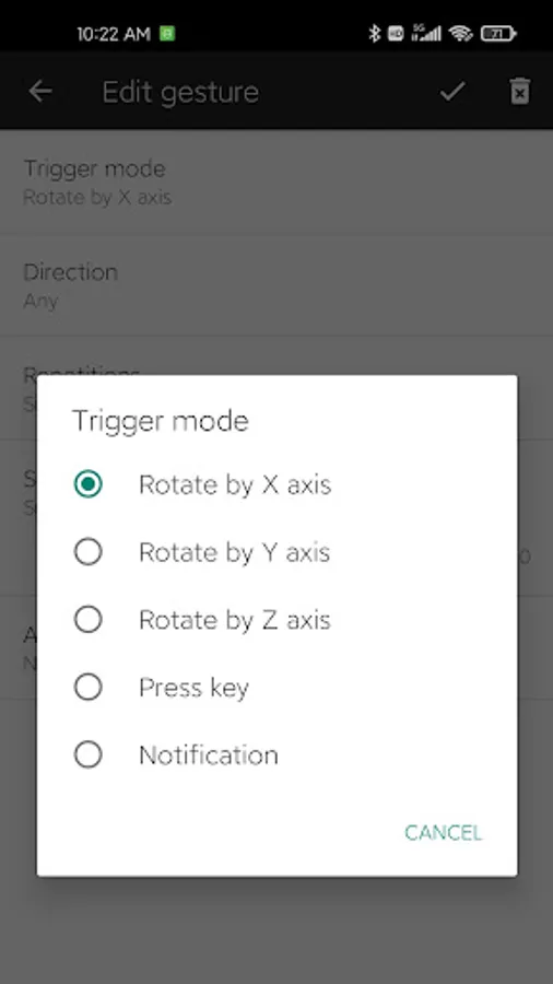 * Support rotate phone action along three axes, customizable action. Default rotation around X-axis (short side of phone) for drop-down notification, rotation around Y-axis (long side of phone) for back, rotation around Z-axis (axis perpendicular to phone screen) for recent apps. The default actions can be a good aid to Android navigation.