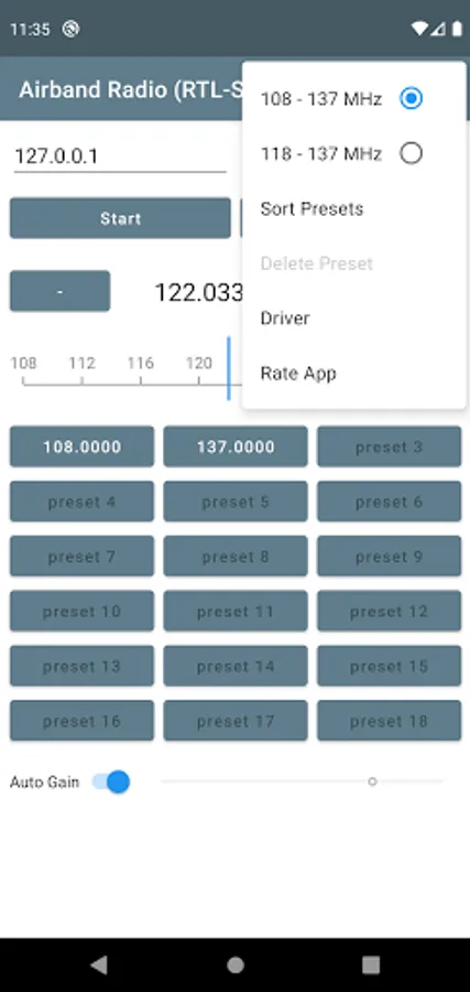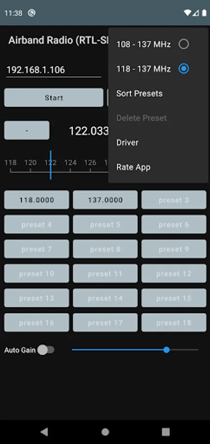 There are two ways to use the application. The first is to use an RTL-SDR dongle and an SDR driver, available from Google Play. Selecting the Driver option in the application menu will open the driver page on Google Play. The second way is to connect to an instance of rtl_tcp running on a remote computer, most likely over WiFi. You will need a good network connection for this to work reliably so use of the driver is probably the preferred way to use the application in most cases.