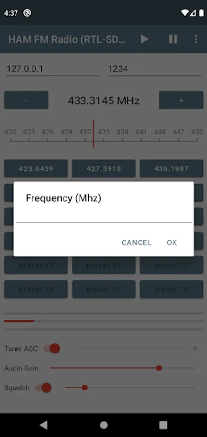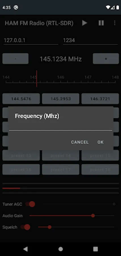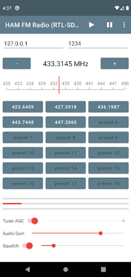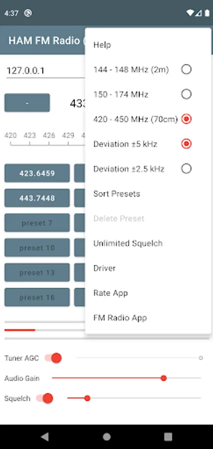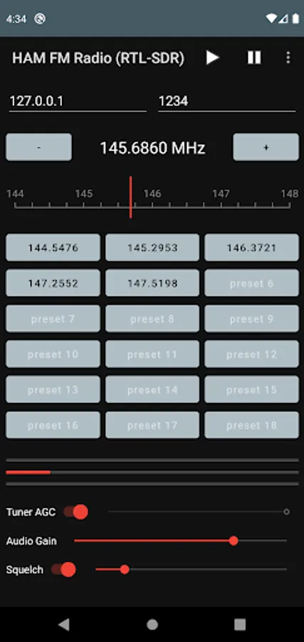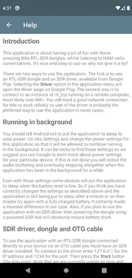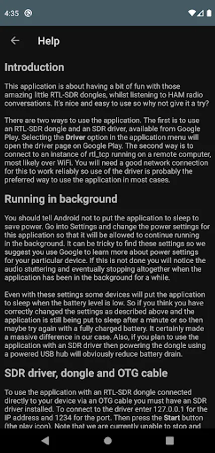 There are two ways to use the application. The first is to use an RTL-SDR dongle and an SDR driver, available from Google Play. Selecting the Driver option in the application menu will open the driver page on Google Play. The second way is to connect to an instance of rtl_tcp running on a remote computer, most likely over WiFi. You will need a good network connection for this to work reliably so use of the driver is probably the preferred way to use the application in most cases.