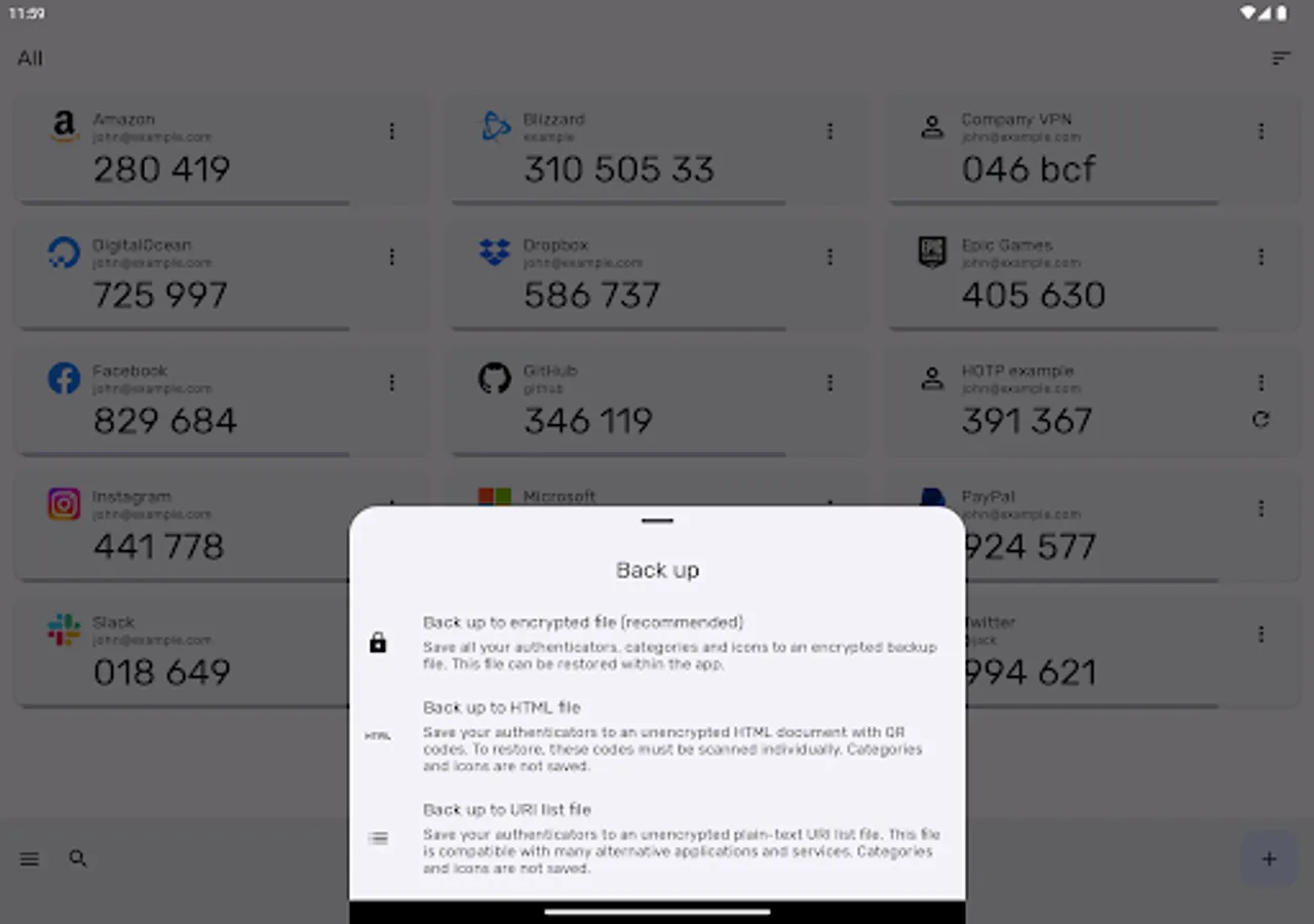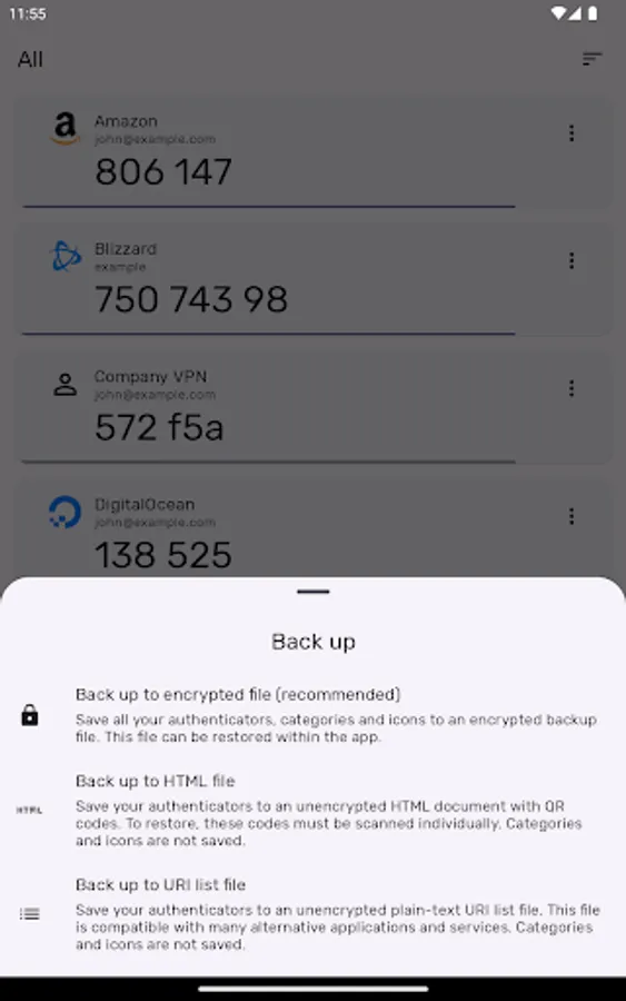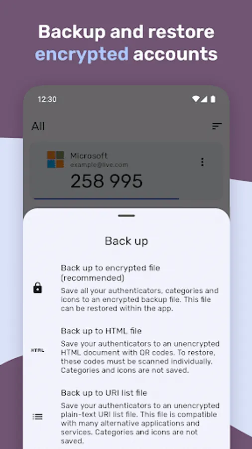 Backup your authenticators with strong encryption. In case you lose your or change phone, you can always gain access to your accounts. Save to cloud storage or to your device.
