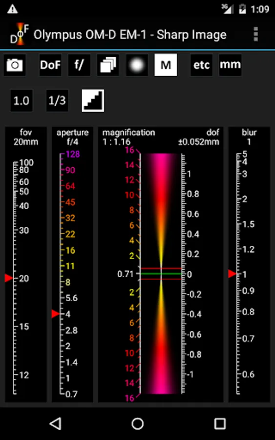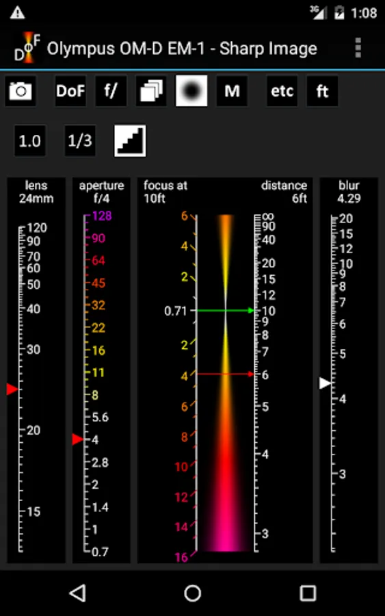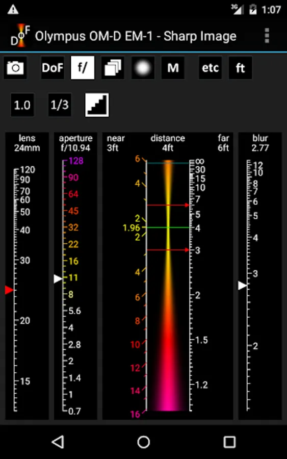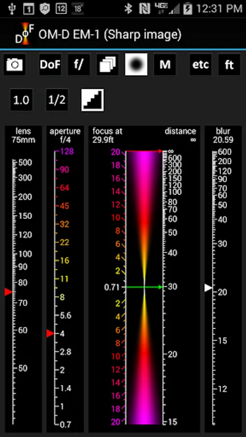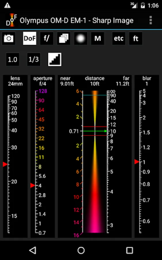 DoF's camera-like display lets you enter parameters by pointing and dragging and then shows you the results immediately. It's unique double-cone also illustrates blur as a function of subject distance.