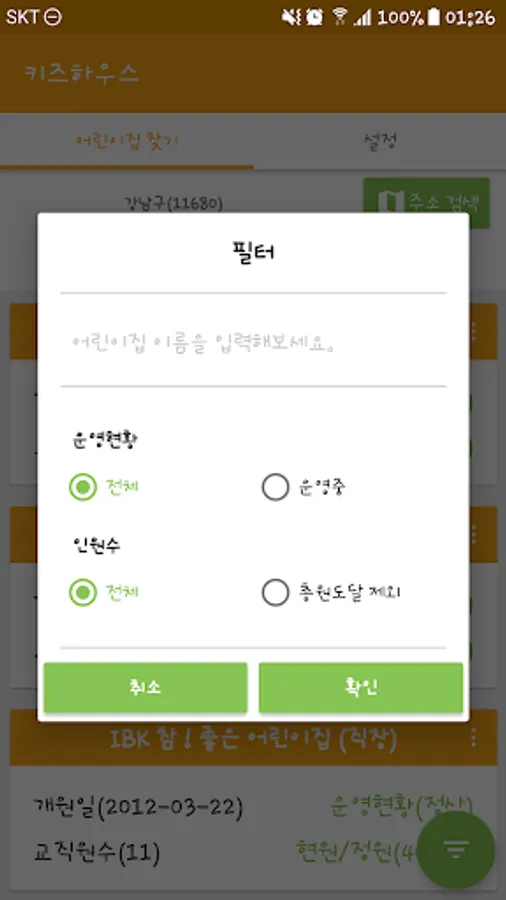 우측 하단의 필터 버튼으로 어린이집명, 정원, 운영상태에 대하여 필터링할 수 있습니다.