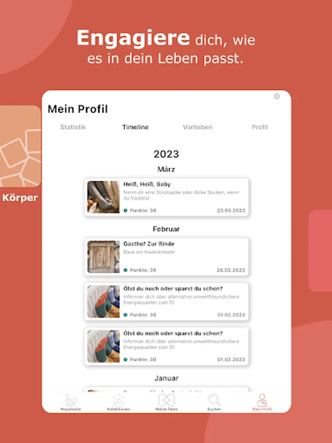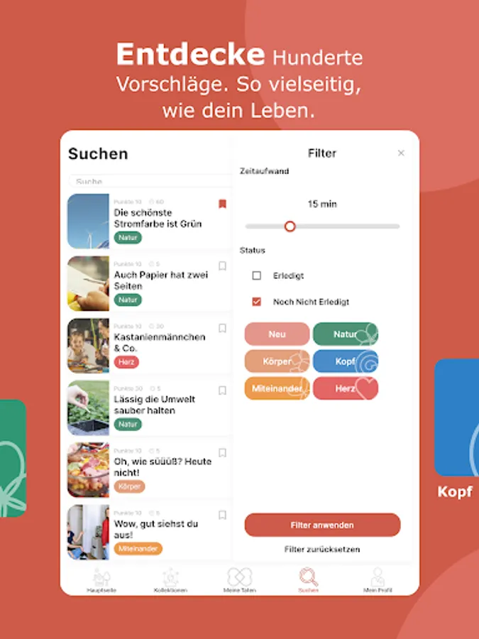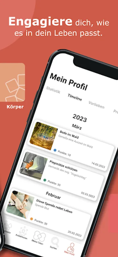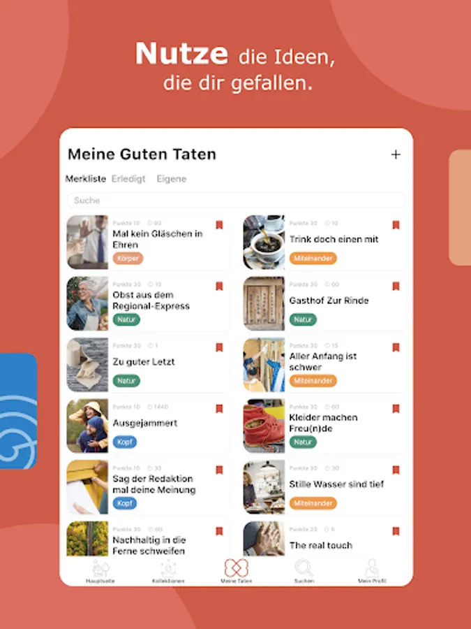 Feel new balance - every day a good deed for more balance in your life. Whether you want to do something good for your body, head or heart, get involved socially or protect the environment: It's easy here. You only need one app to unite all these areas of life.