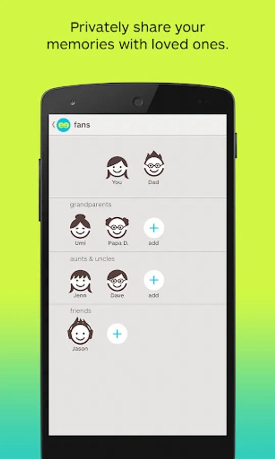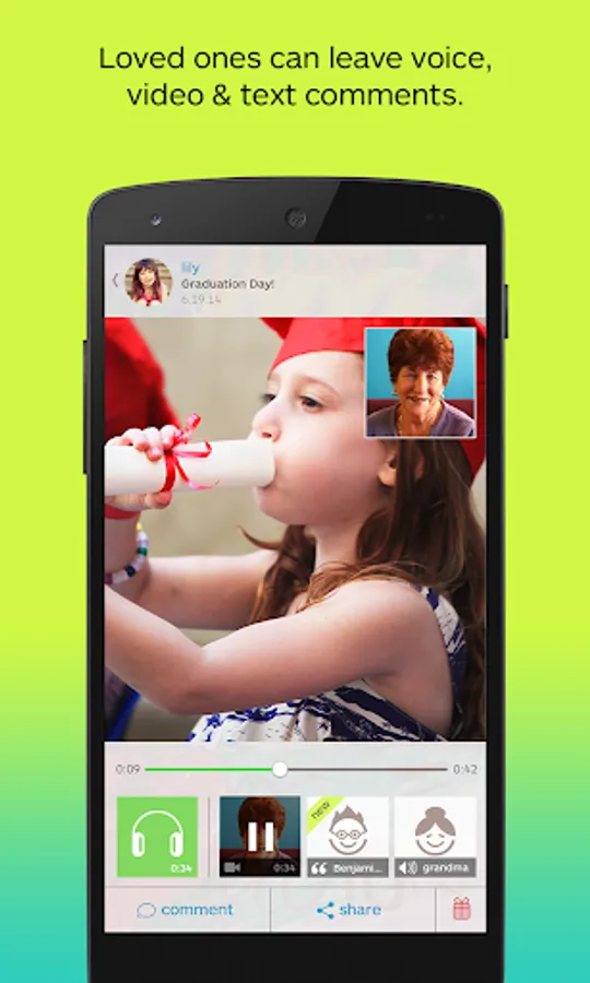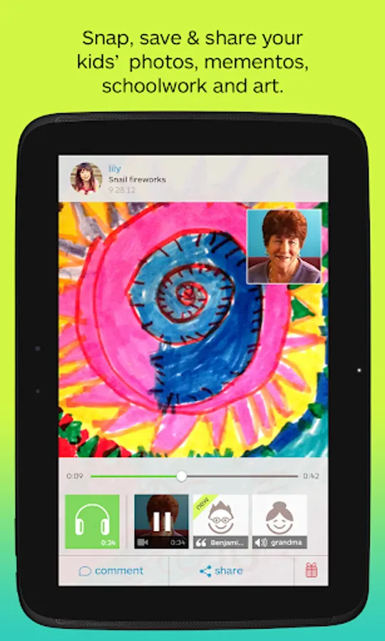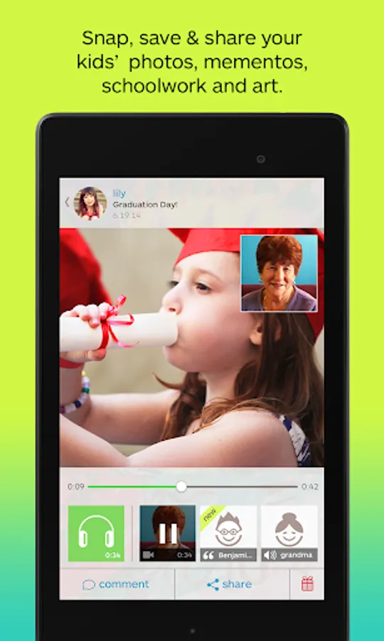 - Easily share via email or the app with grandparents and loved ones so they can see everything you save
