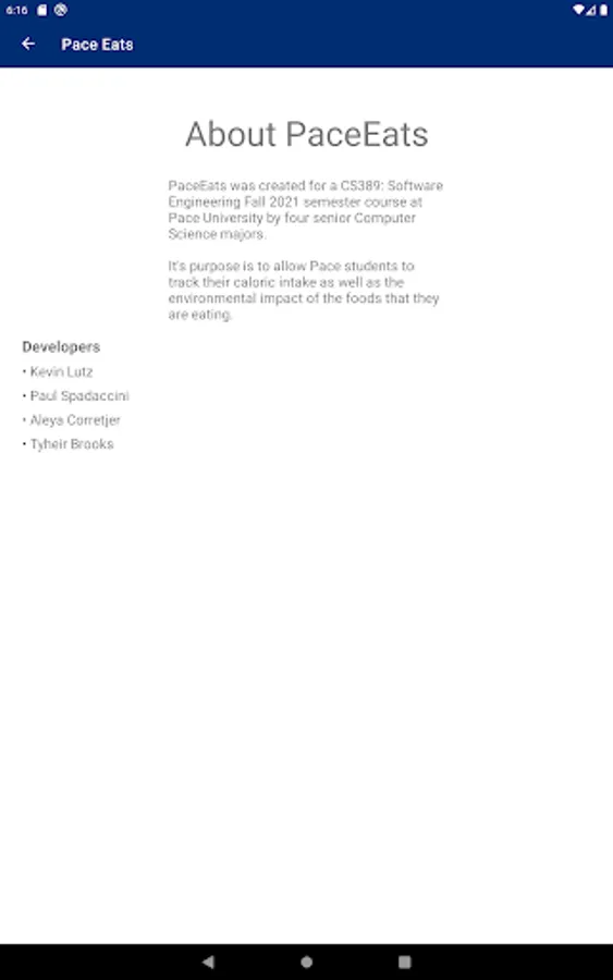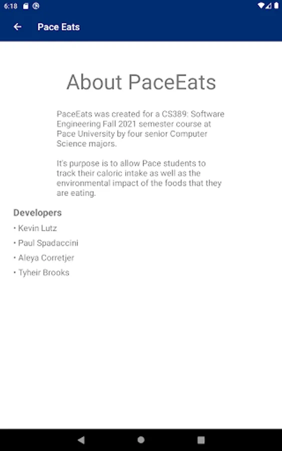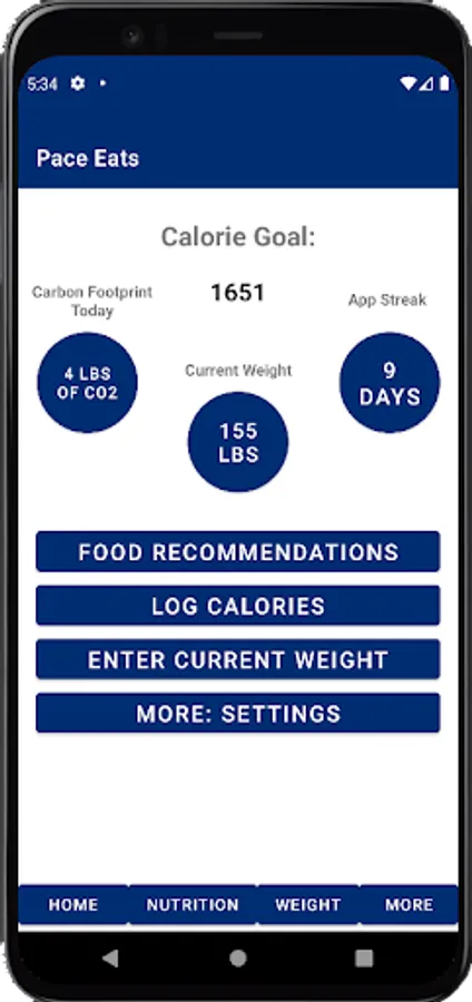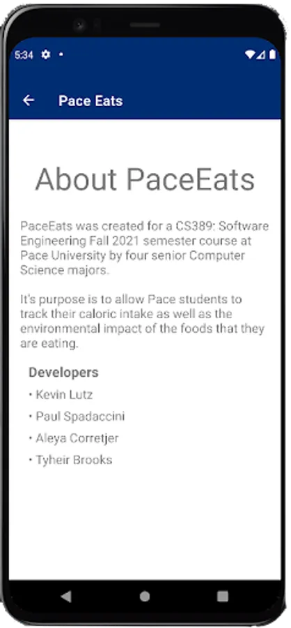 Our app aims to help Pace students eat healthier and more sustainably at dining locations on campus. Users are able to track their calorie intake as well as the carbon footprint that results from the production of the food that they eat. There is also food recommendations to help users find healthy options and weight tracking to help users achieve their goal weight. Created by Kevin Lutz, Paul Spadaccini, Tyheir Brooks, and Aleya Corretjer for CS389: Software Engineering (Fall 2021) course at Pace University.