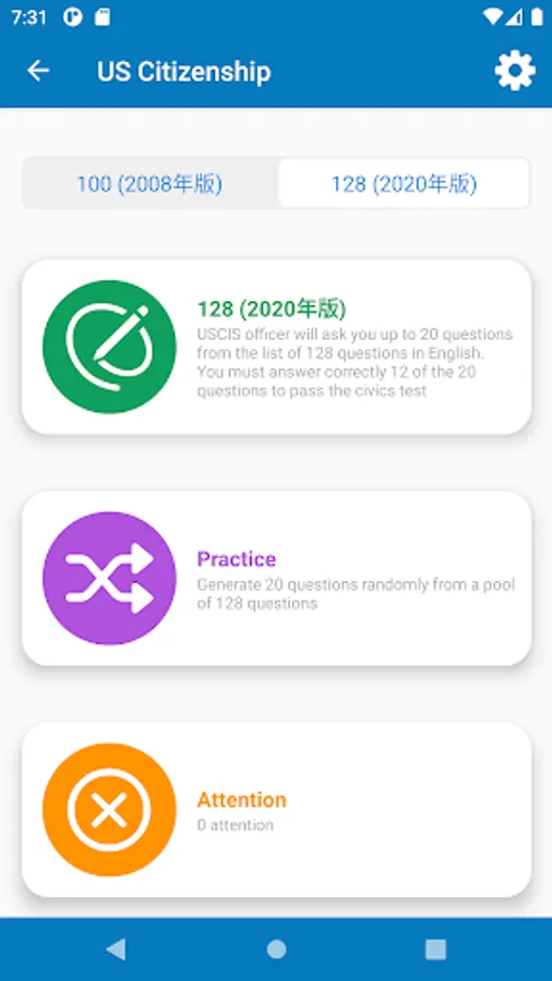 - Provides two (2) versions: 100 questions (released in 2008) and 128 questions (released in 2020)
