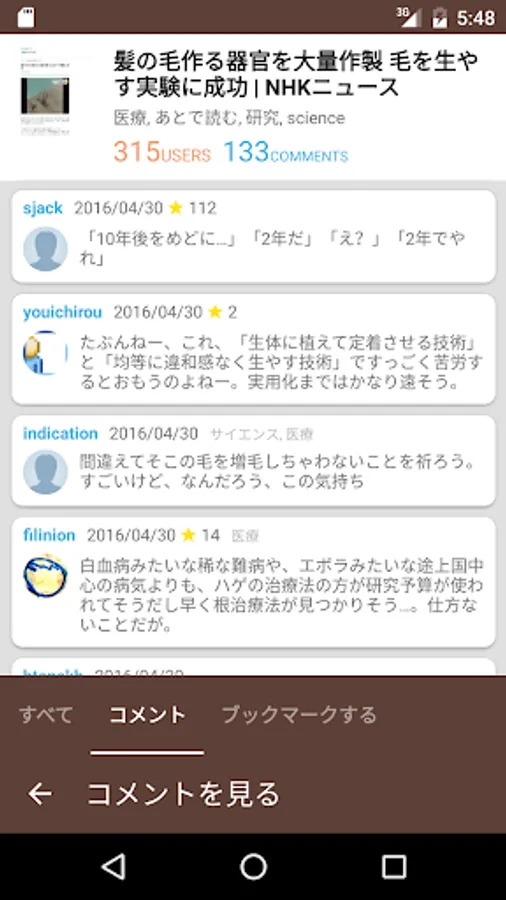 ・ Open the article by tapping the feed, open the bookmark comment list by long tap the feed.