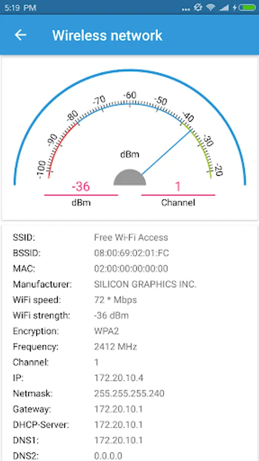 Using this app you will see some more interesting information: WLAN-Name (SSID), BSSID, MAC address, maximum WLAN speed, IP address, external IP address, net capability, net channel, subnet mask, Gateway IP address, DHCP server address, DNS1 and DNS2 address, etc.