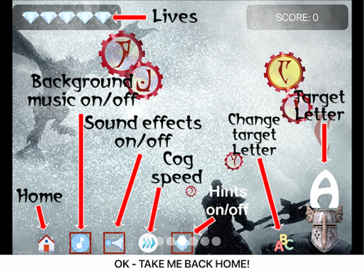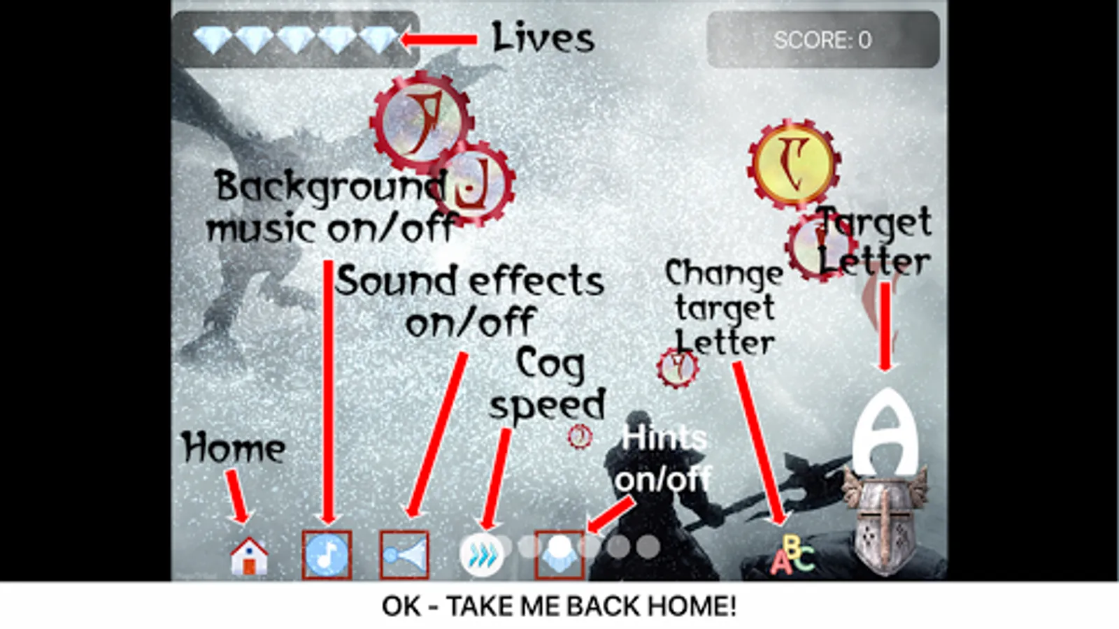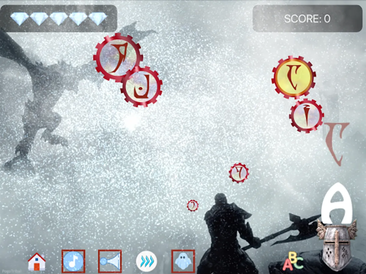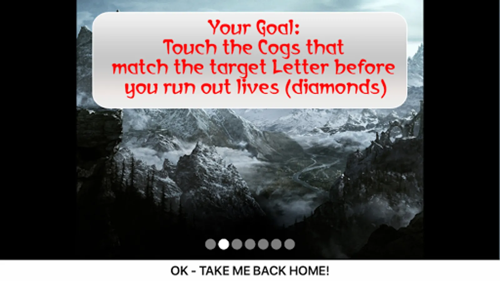 What a great fun way to learn Daedric alphabet from the Elder Scrolls - with Cogs! The goal is simple - a Roman letter is randomly selected and random Cogs with Daedric alphabet characters rise across the screen. When you find a Daedric Cog that matches the goal Roman character touch it, zap it, and get a point. If you zap a Cog that doesn't match you lose a life (diamond). If you miss a matching Cog and it reaches the top you lose a life.