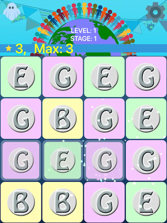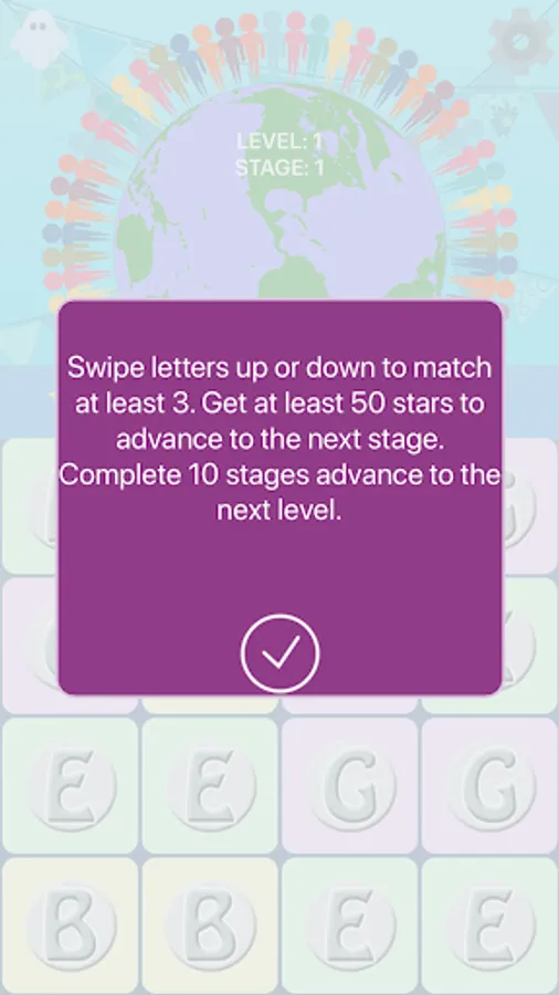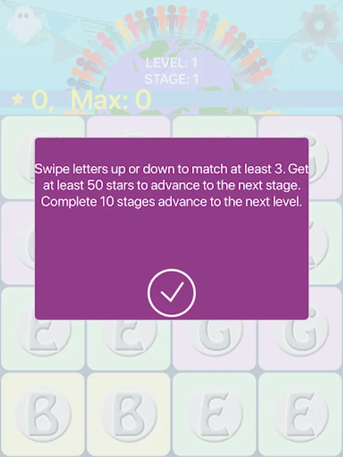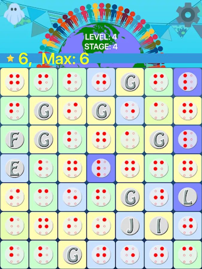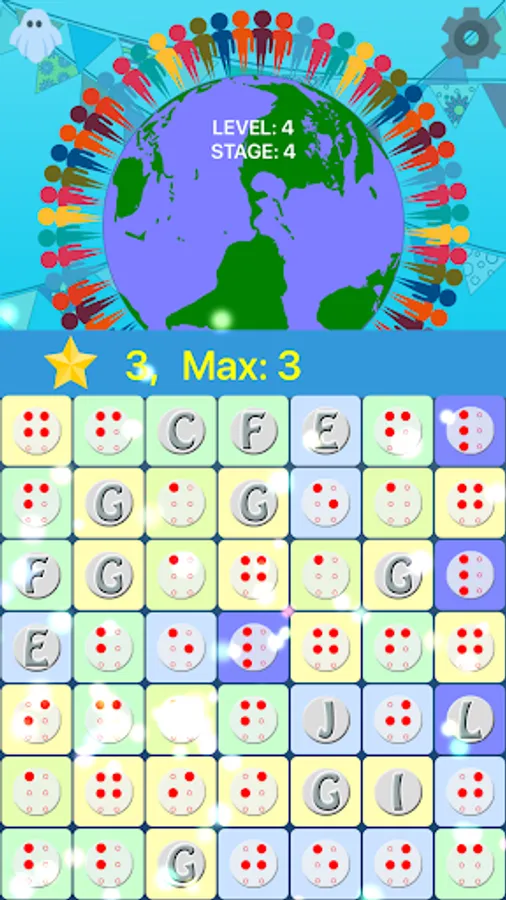 There are 10 stages per level. Each stage increases the odds of a Braille letter appearing. Stage 1 will be all Roman characters. When a match is made the letter will be spoken and that voice is adjustable. To add to the difficulty (or make it a bit easier) you can set vowels and consonants to their own colors.