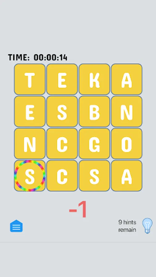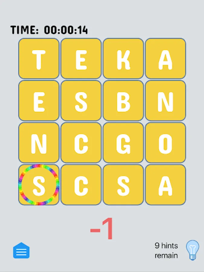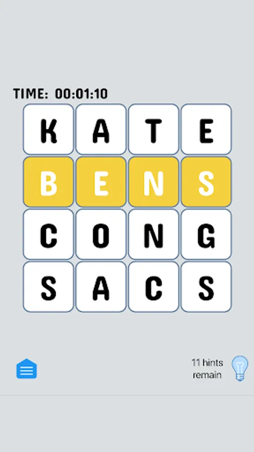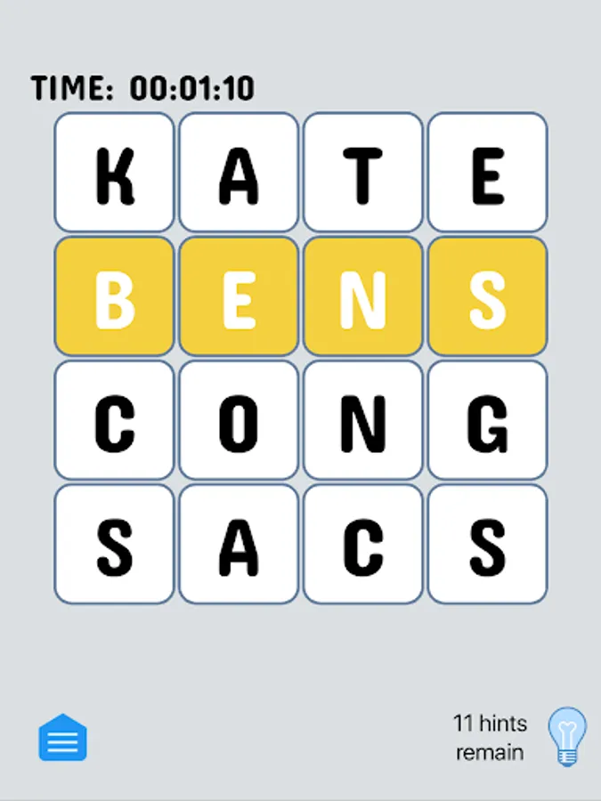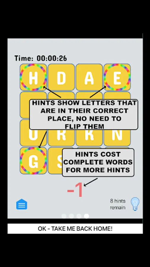 Touch the hint button and all letters that are in their proper place will be briefly highlighted. Using a hint will cost you a hint. You must solve for the word the app has chosen - which will probably help teach you new words!