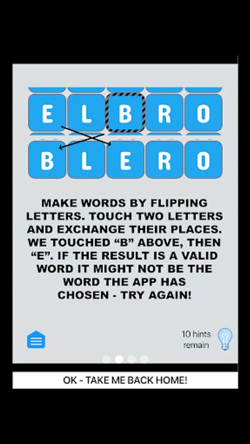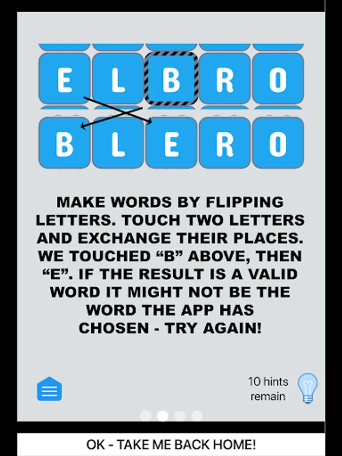 Choose your challenge - 3 letter words up to 10 letter words. Touch letters to swap them. Want more? Solve a word then click on that word and get the definition!