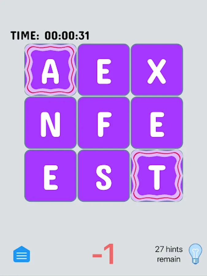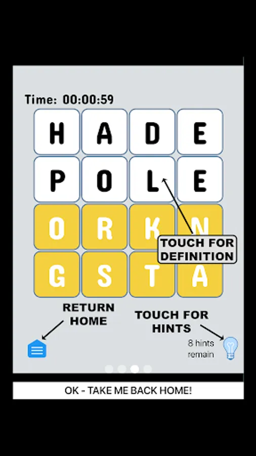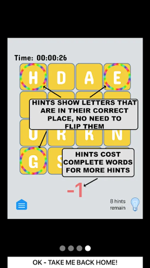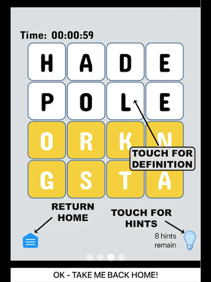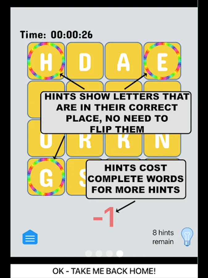 Touch the hint button and all letters that are in their proper place will be briefly highlighted. Using a hint will cost you a hint. You must solve for the word the app has chosen - which will probably help teach you new words! When you find WordWise Min too easy you can always upgrade to WordWise MAX!