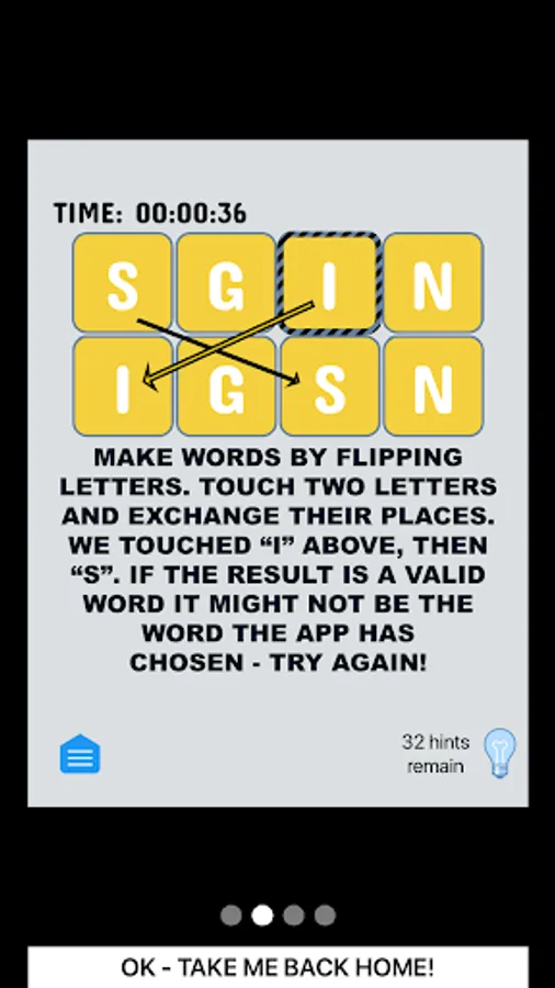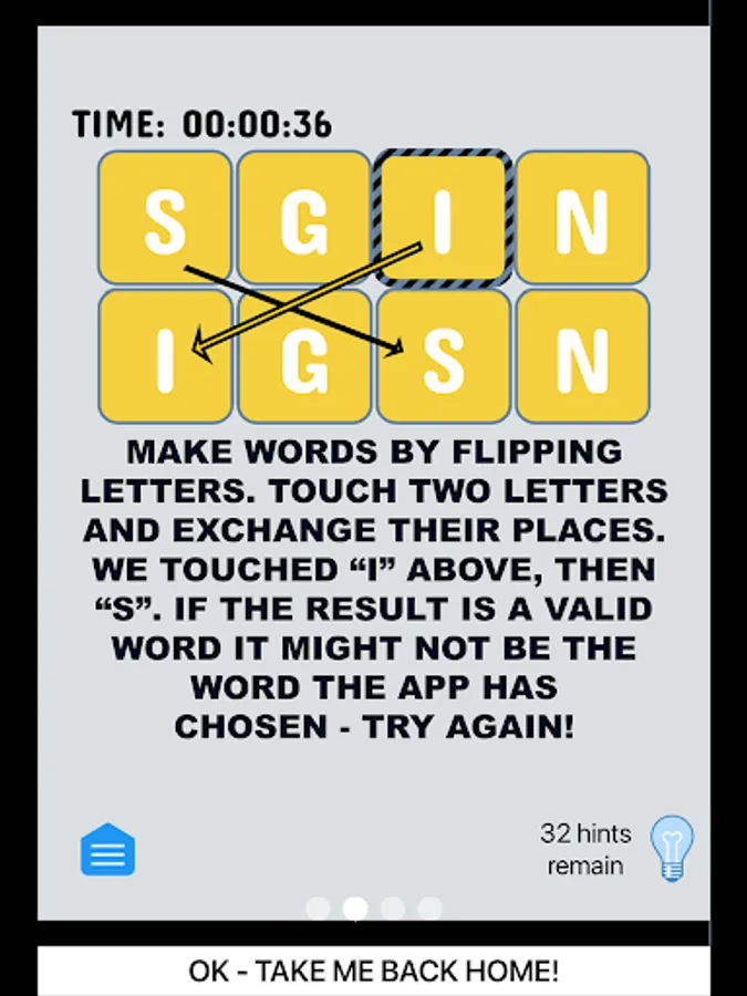 Choose your challenge - 3 or 4 letter words. Touch letters to swap them. Want more? Solve a word then click on that word and get the definition!