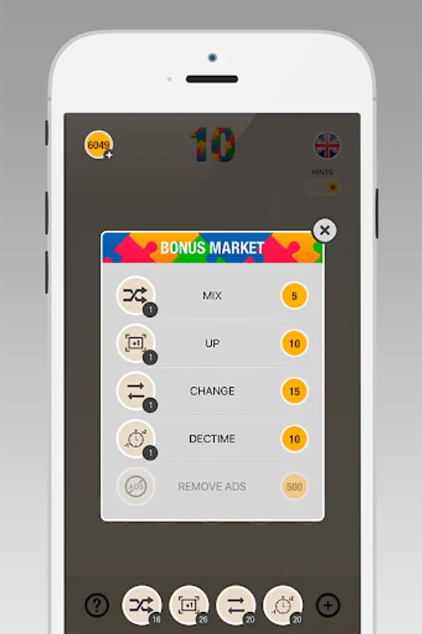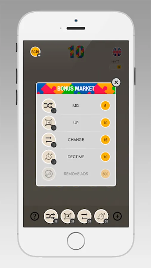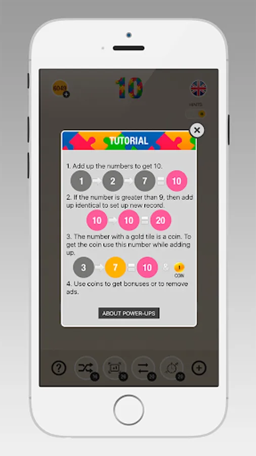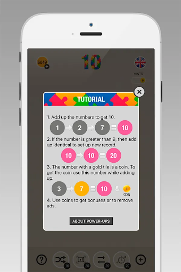 The number with a gold tile is a COIN. Collect coins and use them to get bonuses. 4 various bonuses make the game even more exciting!