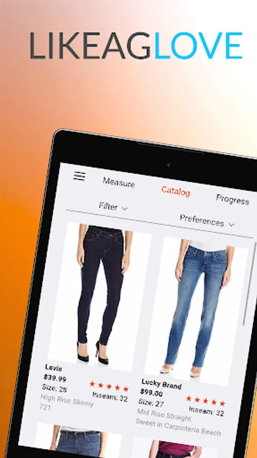 Smart leggings measure your shape in seconds and send the data over Bluetooth to the app. The app then matches your measurements against catalog of jeans and finds brands, models and sizes that will fit your shape best. We don't sell jeans. We help you find what fits. Once you select a pair, click through to that retailer’s website to complete the purchase.