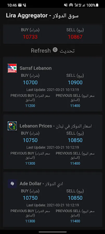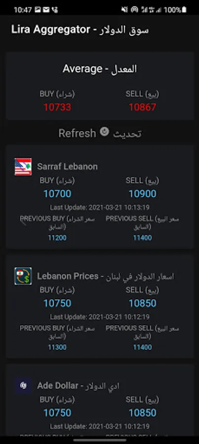 LIRA Aggregator is an application to know the price of the dollar at exchangers in Lebanon, moment by moment. This application helps to solve this problem by checking and displaying all major platforms prices and their average.